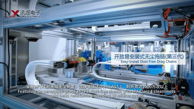 訊煜電子自主研發(fā)的耐折彎測試機(jī) 訊煜開放易安裝式無塵拖鏈,采用ePTFE航天級無塵護(hù)套、潔凈等級達(dá)IPA CLASS ONE,耐折彎達(dá)1000萬次以上,內(nèi)部采用高分子材料柔性線卡,更好地包裹和保護(hù)線纜、減小磨損,保障每根線纜的穩(wěn)定可靠運(yùn)行,同時(shí)提高了無塵拖鏈在高速運(yùn)行過程中的流暢度。支持多層疊加和龍骨支撐,滿足更多線纜集成和長行程應(yīng)用場景需求。